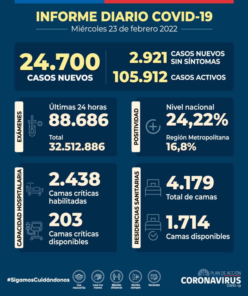 El Ministerio de Salud informa 24.700 casos nuevos de COVID-19, con una positividad de 24,22% en las últimas 24 horas a nivel nacional, con 88.686 exámenes, PCR y test de antígeno. La positividad diaria en la Región Metropolitana es de 16,8%.