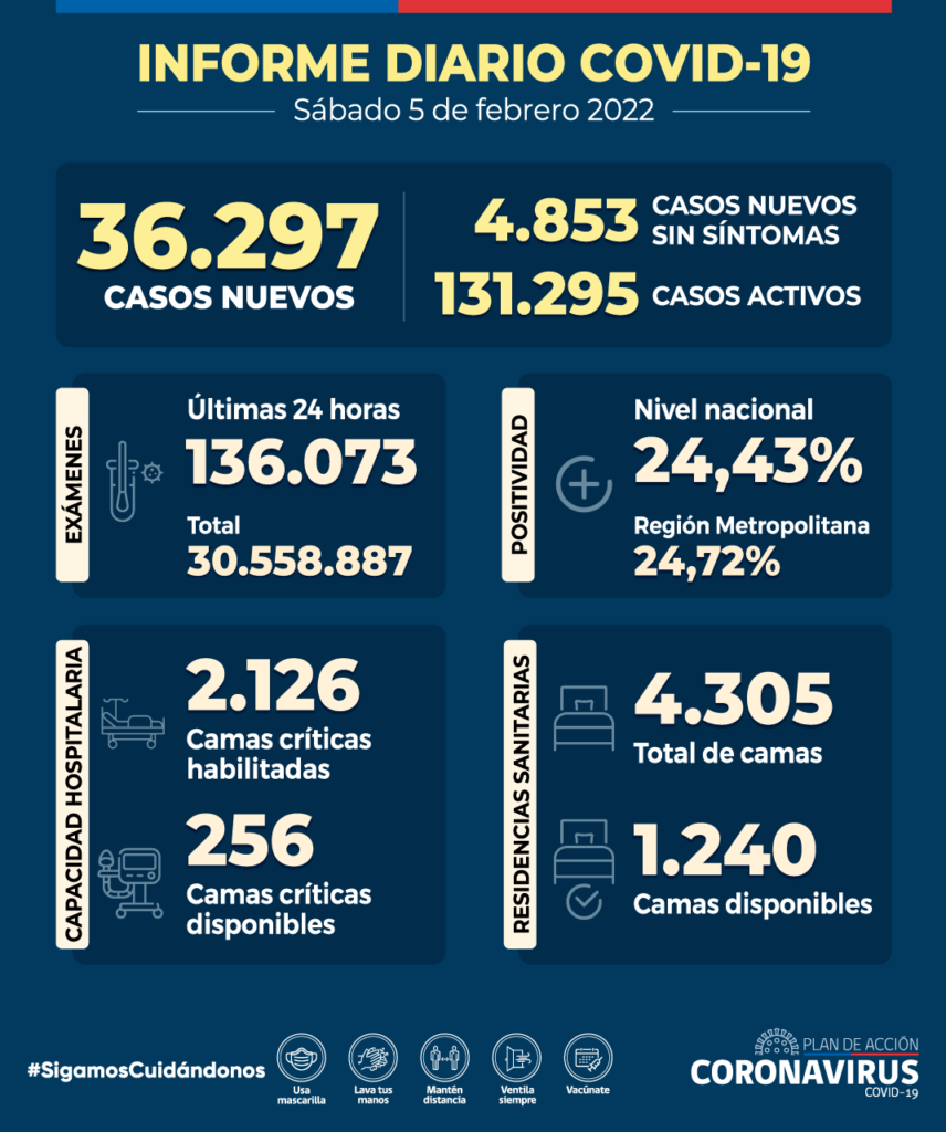 El Ministerio de Salud informa 36.297 casos nuevos de COVID-19, con una positividad de 24,43% en las últimas 24 horas a nivel nacional, con 136.073 exámenes, PCR y test de antígeno. La positividad diaria en la Región Metropolitana es de 24,72%.