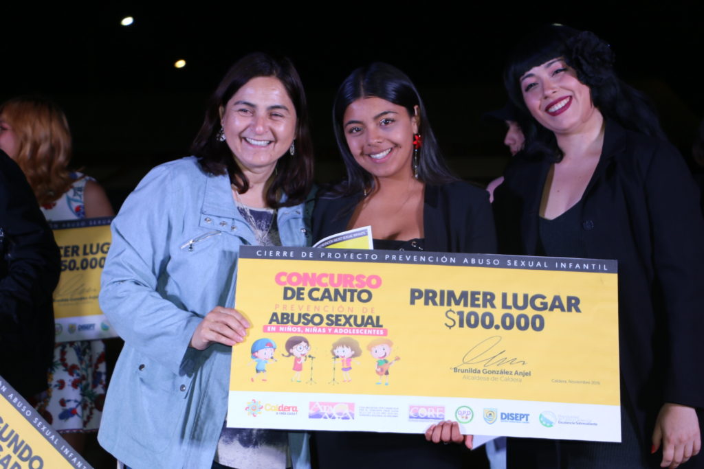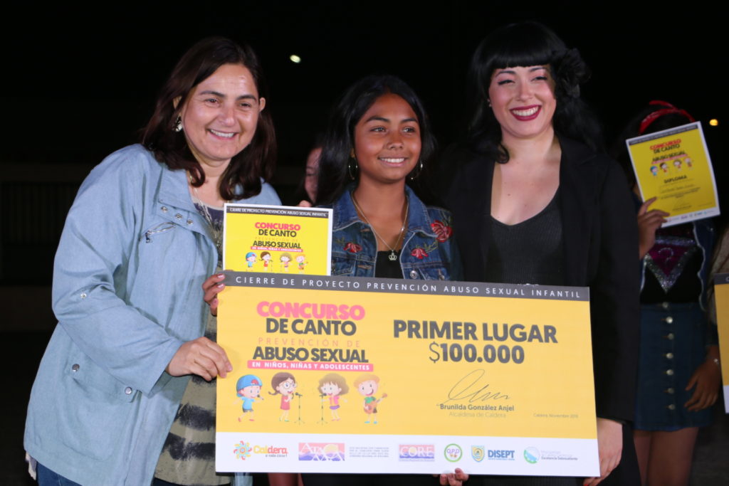 Brunilda González, alcaldesa de Caldera, indicó “Quiero felicitar al gran equipo de la Dirección de Seguridad Pública y Territorial por esta iniciativa que tuvieron en postular al FNDR para conseguir los recursos primero para hacer prevención en un tema sensible como es el abuso sexual en niños, niñas y adolescentes que ojalá nunca ocurriera, cuando esto ocurre es porque anda un pervertido o una pervertida que lo que hace es dañar el centro de una sociedad como son nuestras niñas, niños y adolescentes y se ha finalizado con este festival de voces donde el canto de ellos nunca puede dejar de escucharse y eso es lo que se ha querido hacer en este hermoso festival con una participación impresionante donde hemos visto el talento de las niños y adolescentes que participaron en este sector como es el Bandejón Chorrillos en el corazón de los que significa las poblaciones más vulnerables de nuestra comuna”. En total fueron once los participantes del festival y para ello el jurado compuesto por el compositor y productor Octavio Oyarzun, el productor de fotografías y revistas de moda Jhon Jaque y la coordinadora (s) de la OPD, Javiera Arqueros, quienes tuvieron la difícil misión de elegir a los ganadores de las dos categorías. En la primera categoría de 10 a 14 años los lugares fueron los siguientes; primer lugar para Sthepania Aguirre Alcota con el tema “Hoy tengo ganas de ti”, segundo lugar para Sofía Rojas Pizarro y tercer lugar para Catalina Castro. Mientras que en la categoría de 15 a 18 años, la ganadora fue Constanza Contreras con el tema Love On The Brain de Rihana, el segundo lugar fue para Elías Rozas y tercer lugar para Bárbara Aranda.