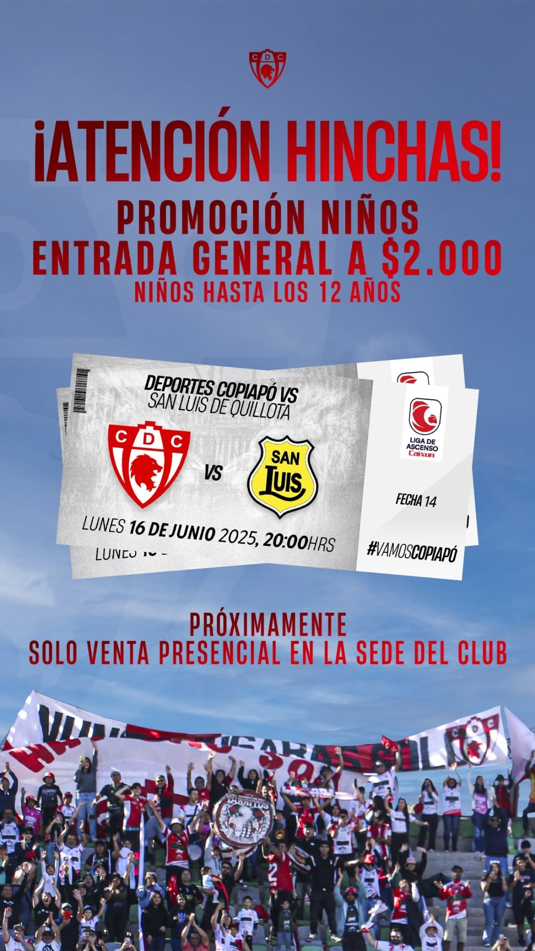 Acotar que Deportes Copiapó invita a los niños a asistir a presenciar el partido junto a sus padres.