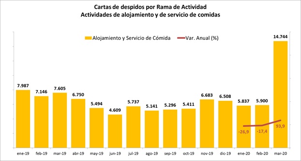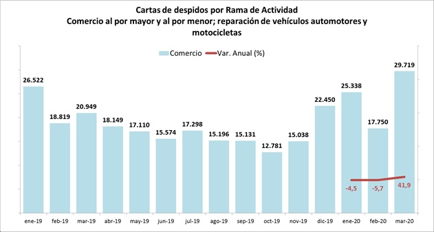 Ante este difícil escenario, la Dirección del Trabajo dio a conocer las últimas cifras de cartas de despidos, con un total de 299.518 despidos en marzo, donde el sector comercio concentra un 9,9% del total, con 29.719 desvinculaciones, y evidenciando una fuerte alza de 47,9% respecto a igual mes del año anterior, y desde septiembre a marzo ya acumula cerca de 100.000 despidos. Por su parte, Actividades de alojamiento y de servicio de comidas marcó un alza de 93,9% anual en los despidos de marzo dando cuenta de la difícil situación que vive el sector, donde muchos actores están imposibilitados de abrir.