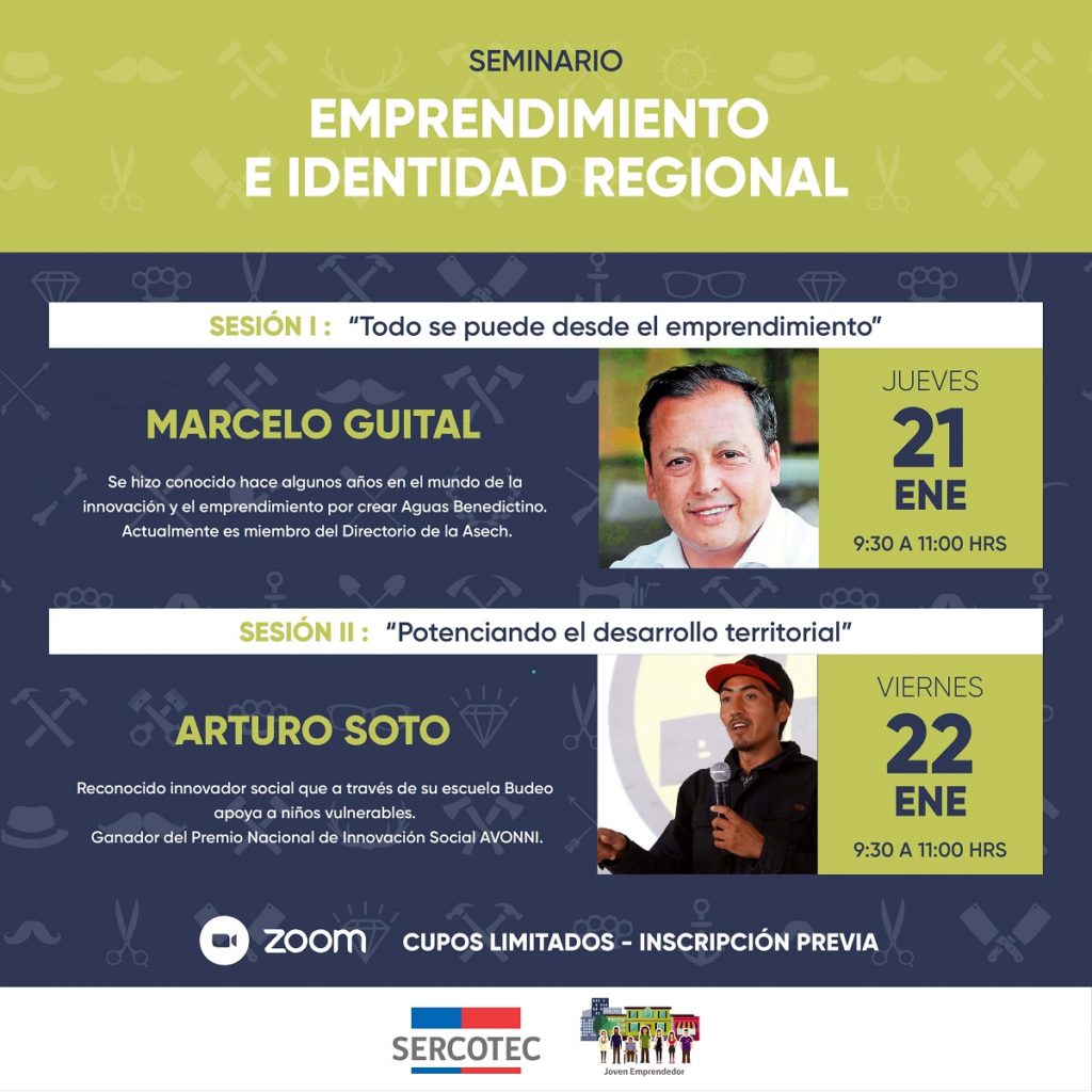 De esta forma los ciclos divididos en tres seminarios “Emprendimiento e identidad Regional”, “Economía Circular y Emprendimientos con Propósito” y “Emprendimiento y pymes: venta con impacto”, contarán con expositores como Marcelo Guital, Arturo Soto, María Emilia Correa y Michel Compagnon.