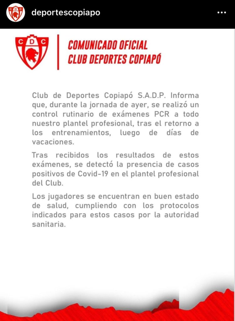 Club de Deportes Copiapó S.A.D.P., en un comunicado de prensa, informó que durante la jornada de ayer se realizó un control rutinario de exámenes PCR a todo el plantel profesional, tras el retorno a los entrenamientos, luego de días de vacaciones.