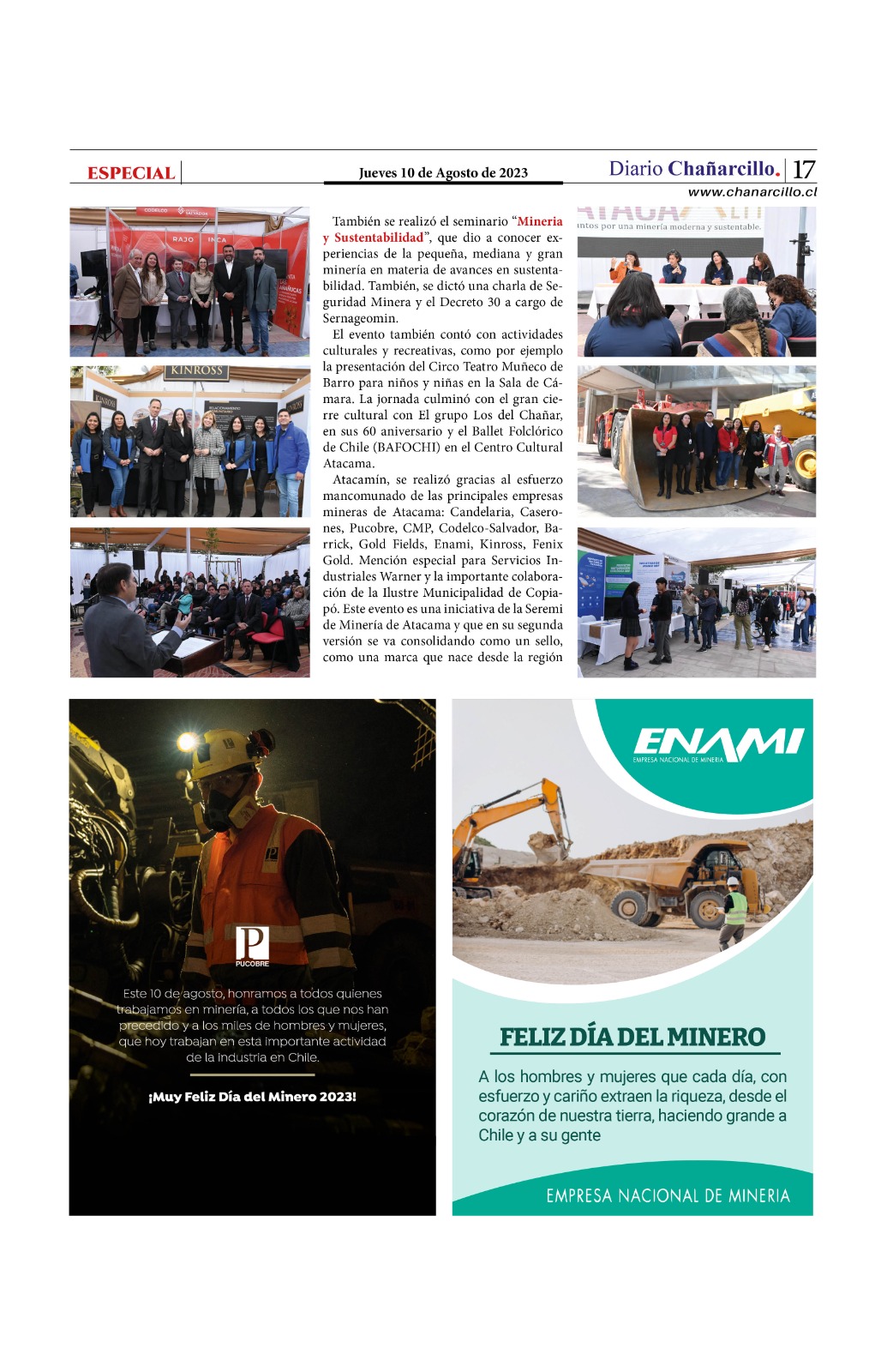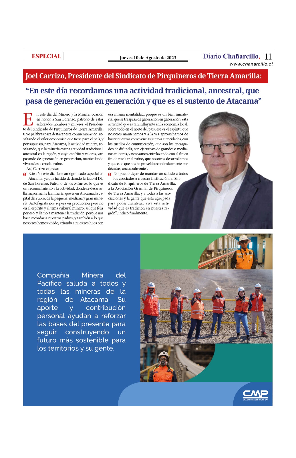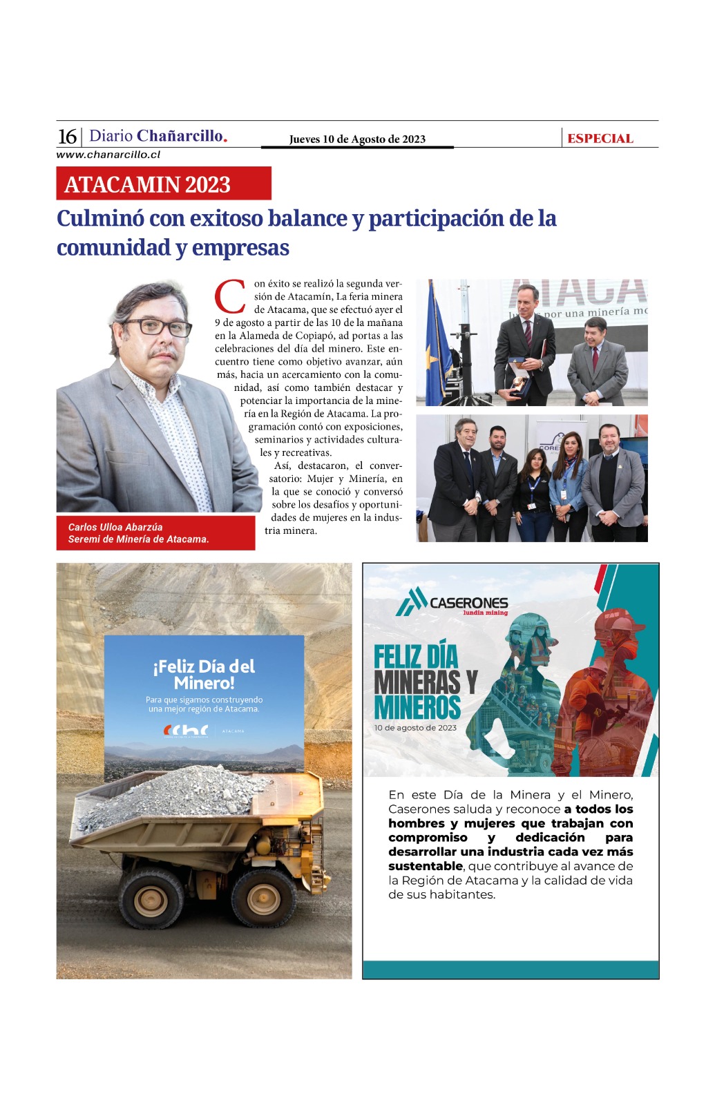 “El jueves salimos a circulación con una Edición Especial de 32 páginas, de las cuales 20 de ellas estuvieron centradas en el Día del Minero a través de un Suplemento completamente a color en el que además se publicaron los saludos – avisos de todos quienes quisieron resaltar esta fecha importante para Atacama, todo enmarcado en la idea que la actividad minera es el principal motor económico de nuestra región y en cuya virtud se ha formado nuestra historia regional. Efectivamente, por primera vez nuestro medio de comunicación logra publicar un Suplemento Minero de esta extensión, de 20 páginas, motivo por el cual queremos reiterar nuestros agradecimientos a los fieles lectores y a nuestros clientes que hicieron posible la materialización de este suplemento que consideró las voces (opiniones) de todos quienes de alguna manera representan esta actividad productiva, ya sea como fuente laboral, la explotación de los minerales, o bien a través de la prestación de servicios a la minería”, subrayó el ejecutivo.