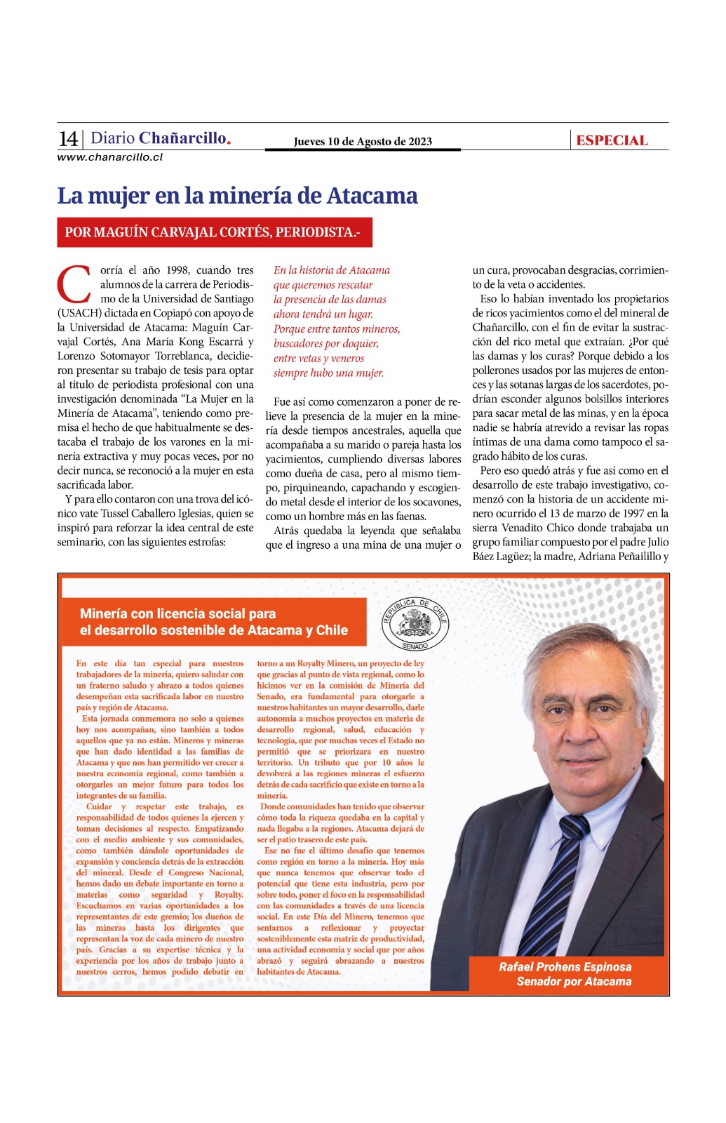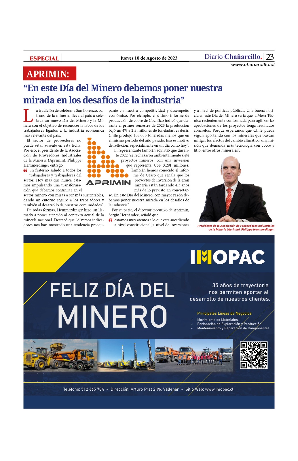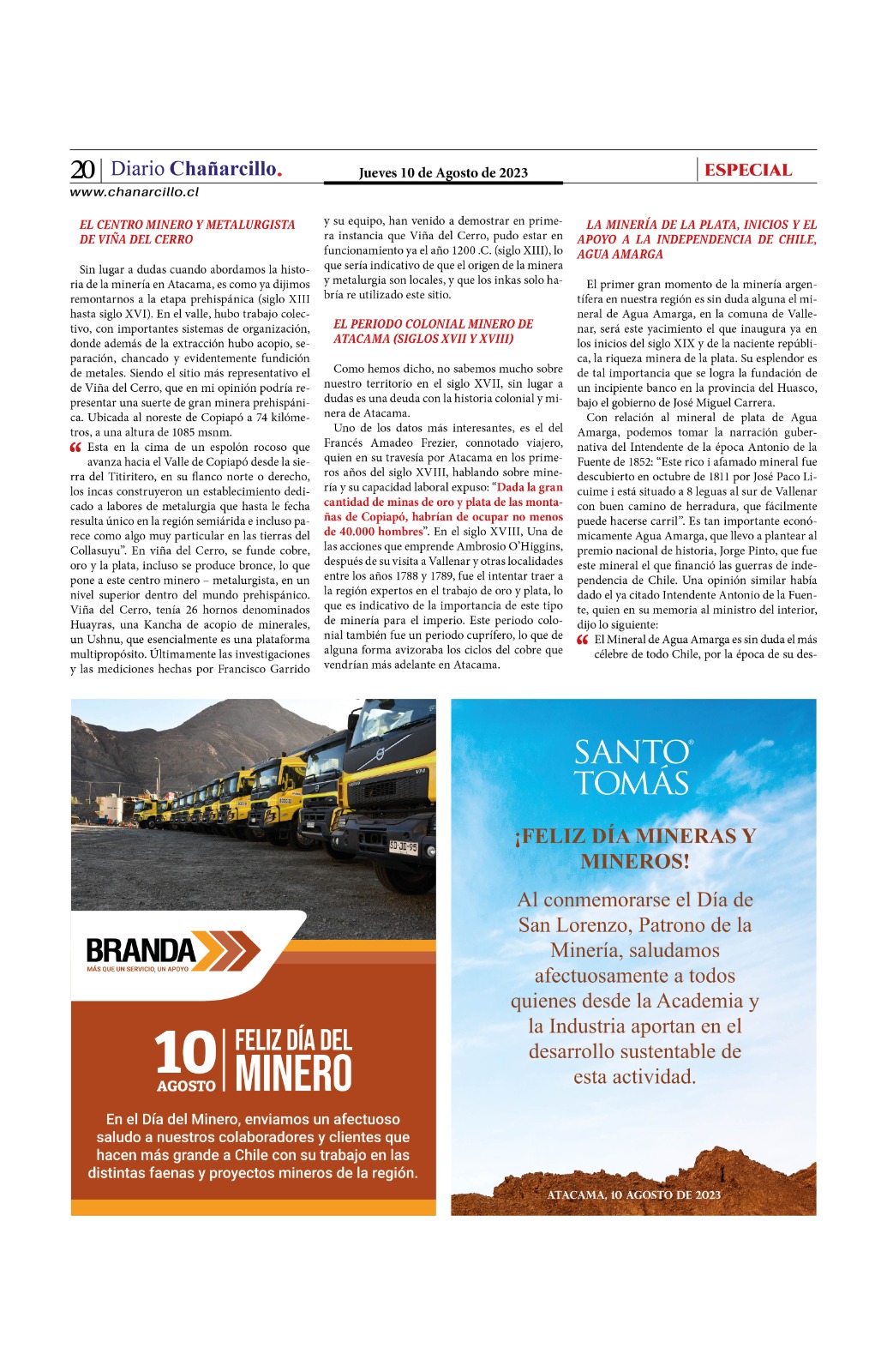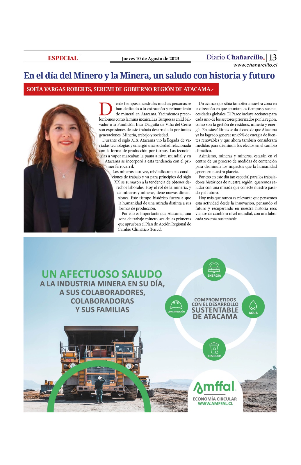 “El jueves salimos a circulación con una Edición Especial de 32 páginas, de las cuales 20 de ellas estuvieron centradas en el Día del Minero a través de un Suplemento completamente a color en el que además se publicaron los saludos – avisos de todos quienes quisieron resaltar esta fecha importante para Atacama, todo enmarcado en la idea que la actividad minera es el principal motor económico de nuestra región y en cuya virtud se ha formado nuestra historia regional. Efectivamente, por primera vez nuestro medio de comunicación logra publicar un Suplemento Minero de esta extensión, de 20 páginas, motivo por el cual queremos reiterar nuestros agradecimientos a los fieles lectores y a nuestros clientes que hicieron posible la materialización de este suplemento que consideró las voces (opiniones) de todos quienes de alguna manera representan esta actividad productiva, ya sea como fuente laboral, la explotación de los minerales, o bien a través de la prestación de servicios a la minería”, subrayó el ejecutivo.