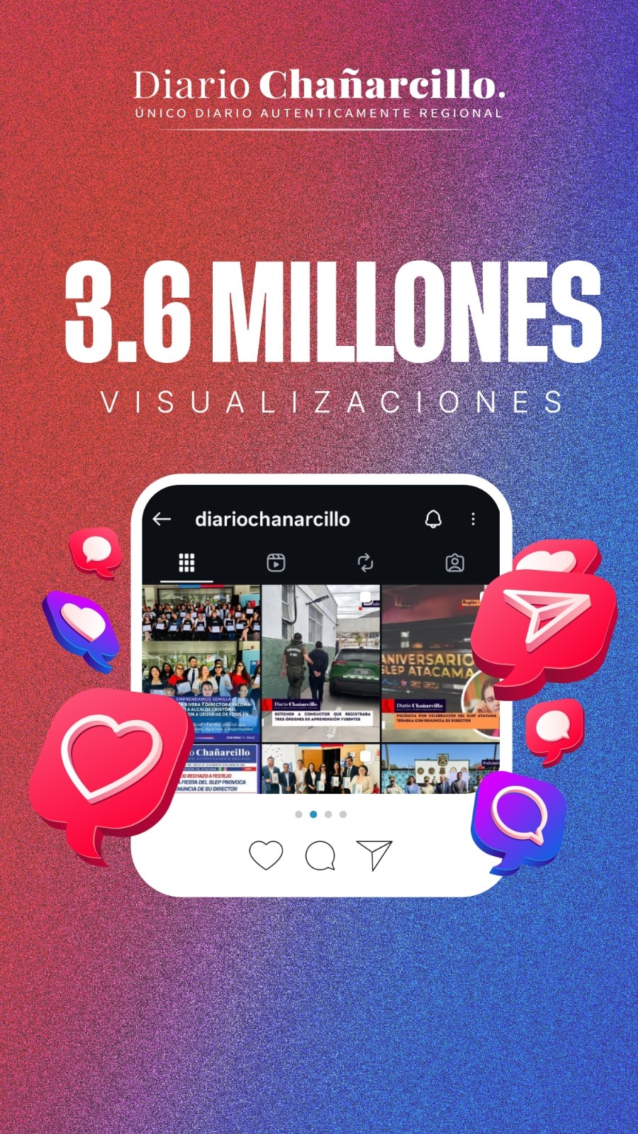 De acuerdo con las estadísticas de Meta Business Suite e Instagram Insights, entre el 14 de diciembre y el 12 de enero, las plataformas de Diario Chañarcillo registraron más de 3,6 millones de visualizaciones totales, con un crecimiento cercano al 3% respecto del período anterior. De este total, más del 99 por ciento corresponde a alcance orgánico, sin inversión significativa en publicidad, lo que evidencia una alta preferencia y fidelización de las audiencias.
