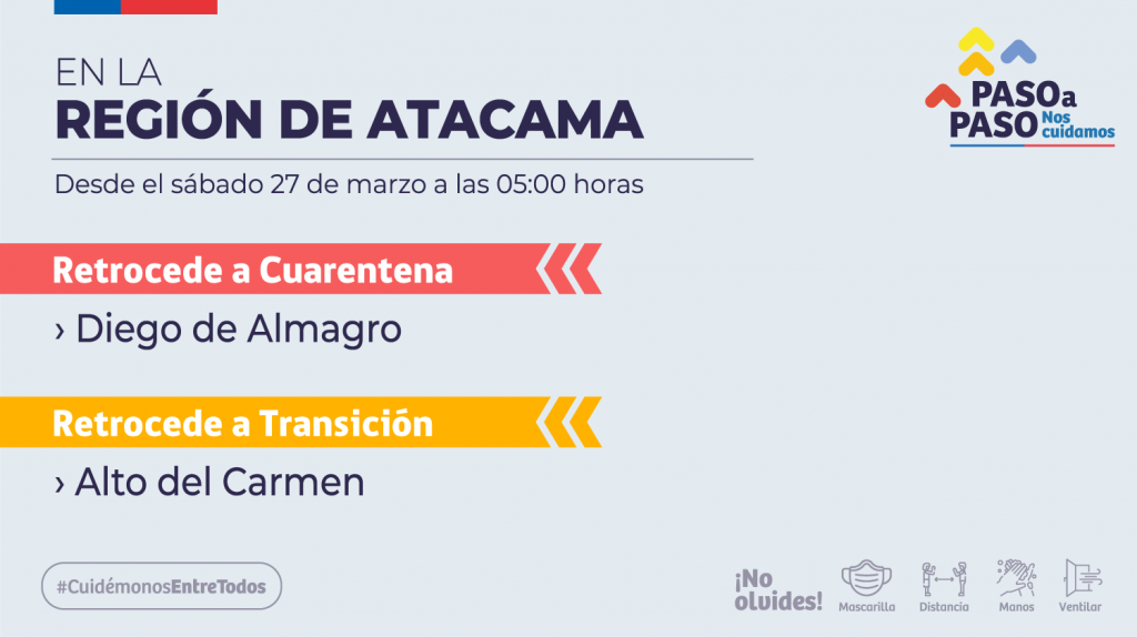 *Alto del Carmen retrocederá a fase 2 de transición, mientras que Diego de Almagro retrocede al paso 1 de cuarentena total, lo anterior entra en efecto para ambas comunas desde el sábado 27 de marzo a las 5 horas.