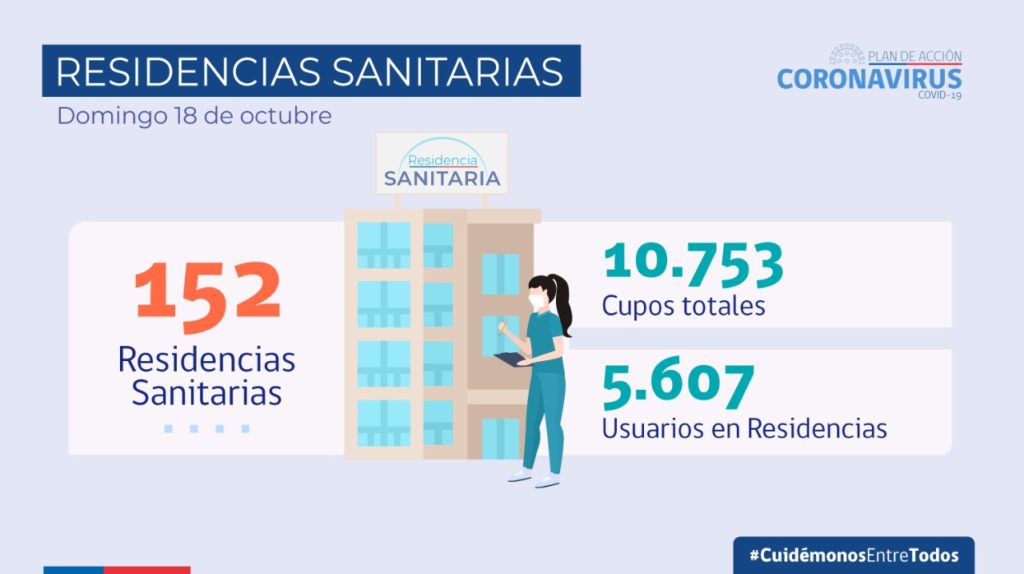 A la fecha, la cifra de Residencias Sanitarias disponibles es de 152 con 10.753 cupos. Al día de hoy cuentan con 5.607 usuarios considerando todas las regiones del país. Para mayor información, las personas que no cuenten con las condiciones para realizar una cuarentena efectiva en su hogar y requieran trasladarse a una Residencia Sanitaria, pueden llamar al Fono 800 726 666 o ingresar al sitio web del Ministerio de Salud, www.minsal.cl