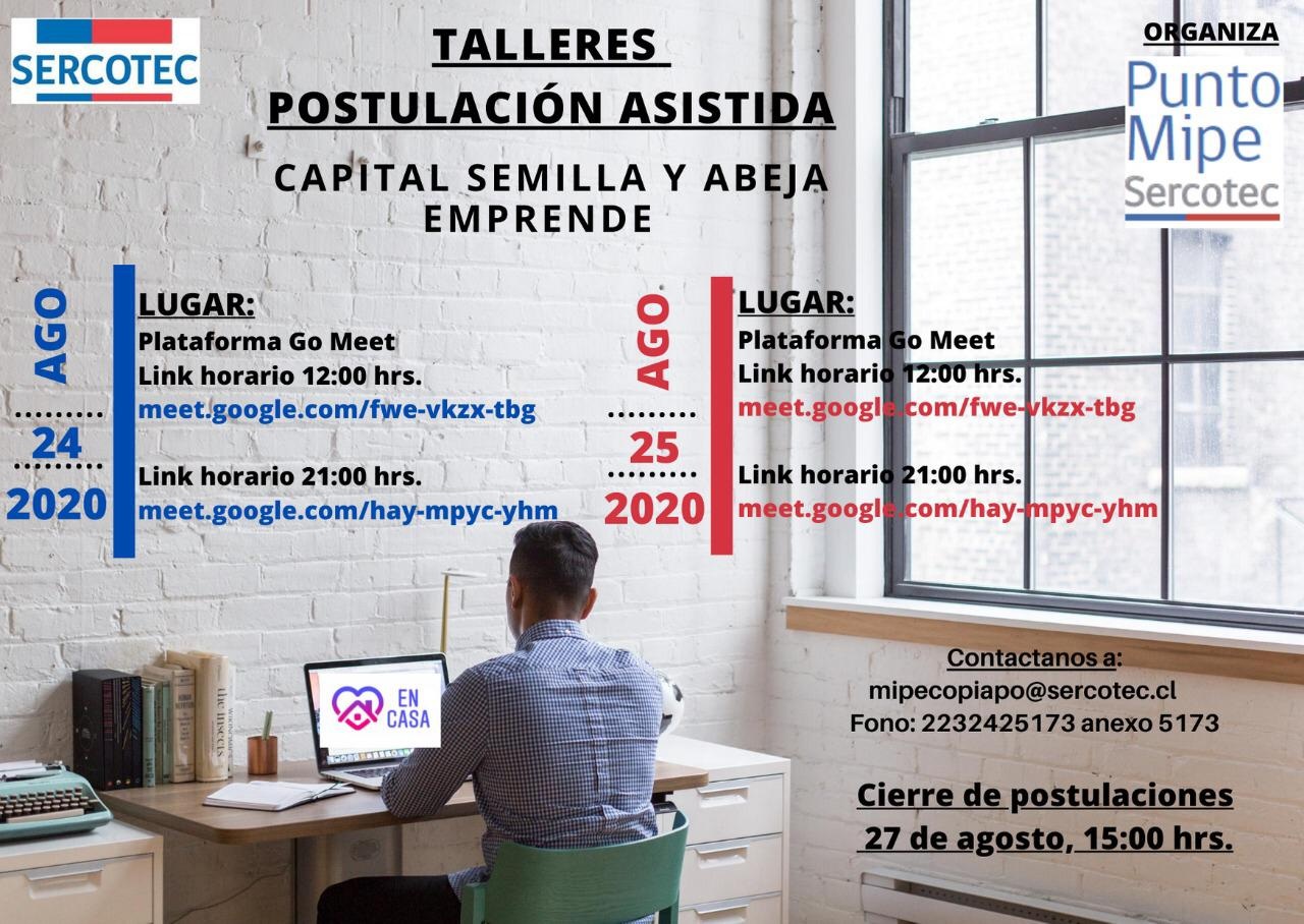 Punto Mipe de Sercotec ha organizado para la presente semana talleres de postulación asistida para los programas Capital Semilla Emprende FNDR y Capital Abeja Emprende FNDR, que tienen como objetivo apoyar a todos los emprendedores de la Región de Atacama.