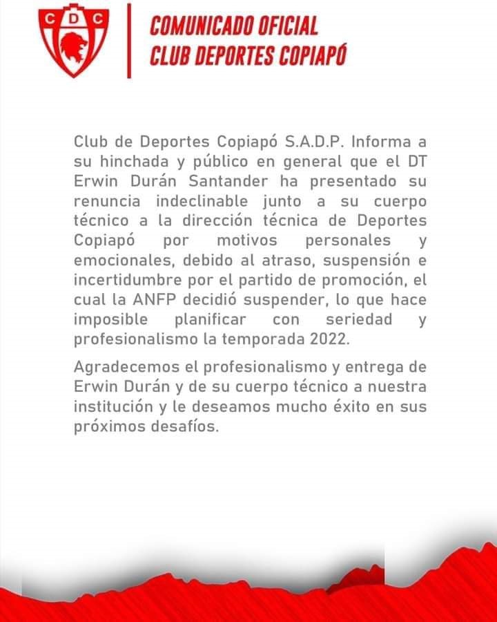 Deportes Copiapó comunicó que el entrenador Erwin Durán, junto a todo su cuerpo técnico, presentaron su renuncia «indeclinable» al cuadro nortino, que aún espera por jugar la Promoción.