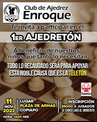 AJEDREZ: El Club de Ajedrez Enroque de Copiapó, ha organizado una jornada denominada Primer Ajedretrón, que tendrá lugar desde las 14.00 horas del sábado 11 en la Plaza Prat de Copiapó. Para participar se debe cancelar la suma de $5.000 por competidor, y todo lo que se recaude en la jornada se depositará cuenta 24.500-03 de Banco de Chile.