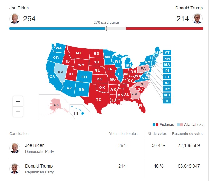 Por el momento el demócrata Joe Biden cuenta con 264 votos electorales (el sistema asigna a cada estado una cantidad de «votos») contra 214 de Trump, esto de 270 votos necesarios para ganar la elección, sin embargo, el conteo continúa, faltando aún estados clave para decidir el proceso, como Nevada, que con sus 6 votos electorales podría darle la victoria a Biden.