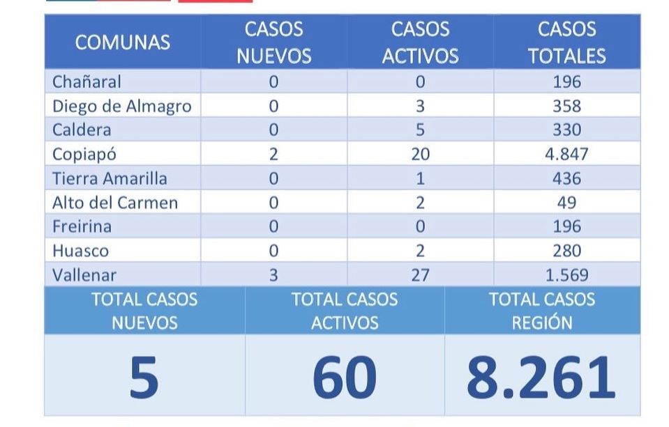 La Autoridad Sanitaria informó que ayer sábado que se registraron 5 nuevos casos positivos de Covid -10 en la Región de Atacama.