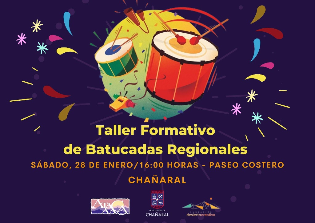 Mañana sábado 28 de enero, a partir de las 16:00 horas, se desarrollará un colorido Taller de Batucadas Regionales en el Paseo Costero de Chañaral.