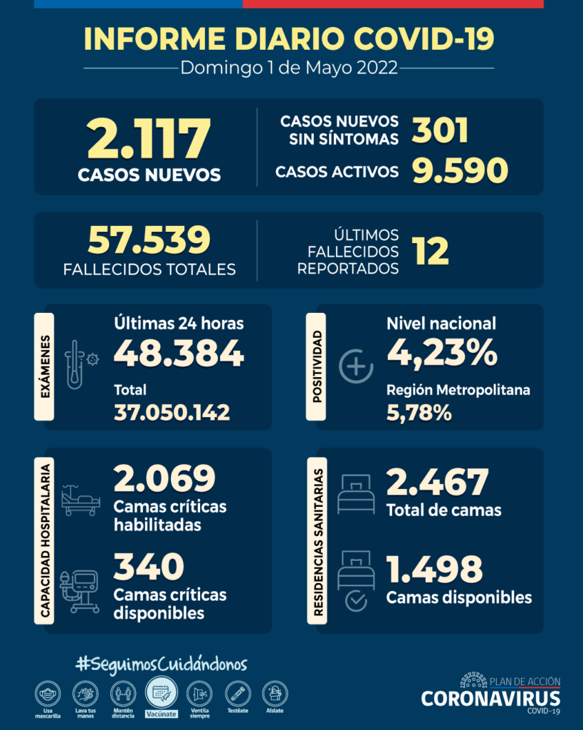 El Ministerio de Salud informó de 2.117 casos nuevos de Covid-19, con una positividad de 4,23% en las últimas 24 horas a nivel nacional, con 48.384 exámenes, PCR y test de antígeno. La positividad diaria en la Región Metropolitana es de 5,78%.