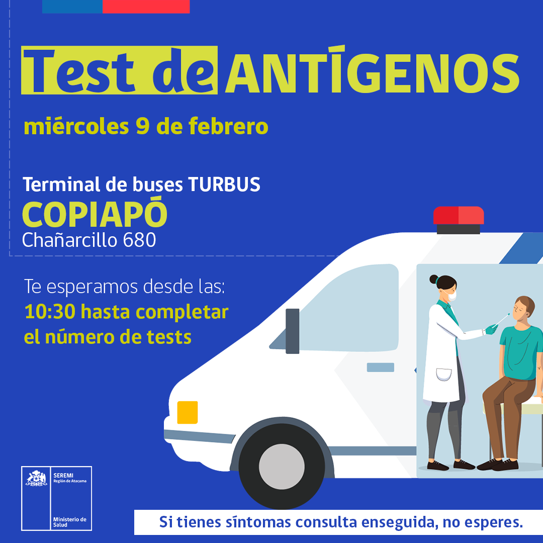 En el día de hoy, la Seremi de Salud de Atacama, estará realizando testeo de antígenos en el terminal de buses TURBUS, ubicado en calle Chañarcillo 680, en Copiapó con su móvil BAC, desde las 10:00 hasta completar el número de tests