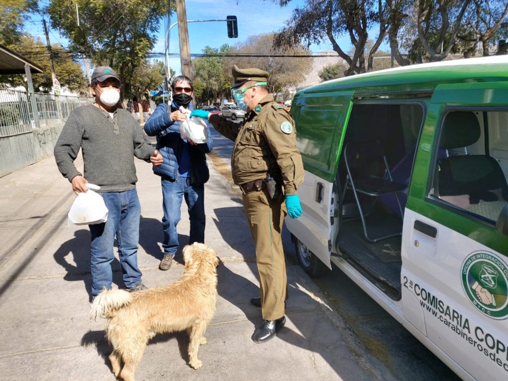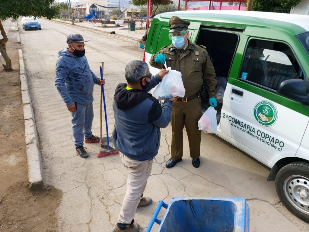 El general Juan Pablo Caneo Farías, Jefe de la III Zona de Carabineros Atacama, destacó el trabajo que está desarrollando el personal comunitario para materializar este programa, el cual surgió a través de un convenio suscrito a nivel nacional, por el Ministerio de Desarrollo Social y Familia y Carabineros de Chile. “El personal comunitario, conocedor de las problemáticas que existen en los diversos sectores de la comuna, está recorriendo aquellos lugares donde pernoctan estas personas, a quienes además de distribuir los alimentos y artículos de higiene, realiza una encuesta sanitaria que permite pesquisar posibles contagios, se les mide la temperatura y junto a sus antecedentes se ingresan en una planilla, que facilita el registro de estas personas”, comentó el general Caneo.