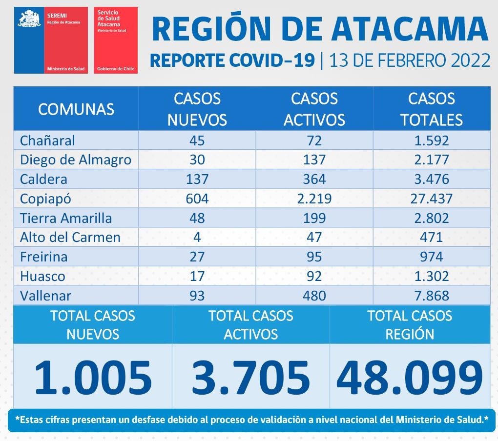 En el día de hoy se registran 1.005 nuevos casos positivos de Coronavirus en la región de Atacama