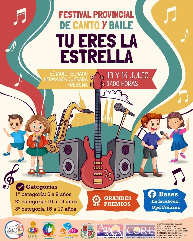 La Oficina Protección de Derechos Infantil Juvenil Comuna de Freirina está convocando a participar en lo que será el Festival Provincial de Canto y Baile `Tú eres la Estrella’; a desarrollarse durante los días 13 y 14 de julio.