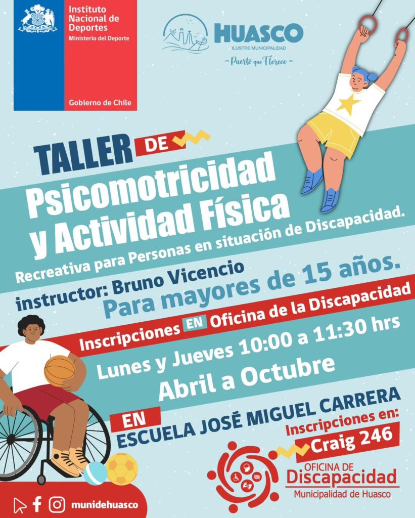 La Oficina de Discapacidad de la Municipalidad de Huasco, y el Instituto Nacional del Deporte, han organizado un Taller de Psicomotricidad y Actividad Física Recreativa para Personas en situación de Discapacidad mayores de 15 años.