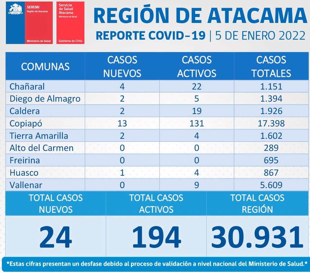 A través de un comunicado, la Seremi de Salud de Atacama confirmó este miércoles 5 de enero, 24 nuevos casos de Covid, sumando un total de 30.931 casos positivos de Coronavirus.