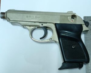 Una vez detenido el sujeto e incautado el arma de fuego se pudo verificar que se trataba de una pistola calibre 9mm., sin munición. En el registro de las vestimentas se encontró en la parte trasera del pantalón un cuchillo tipo carnicero de 25 cms.