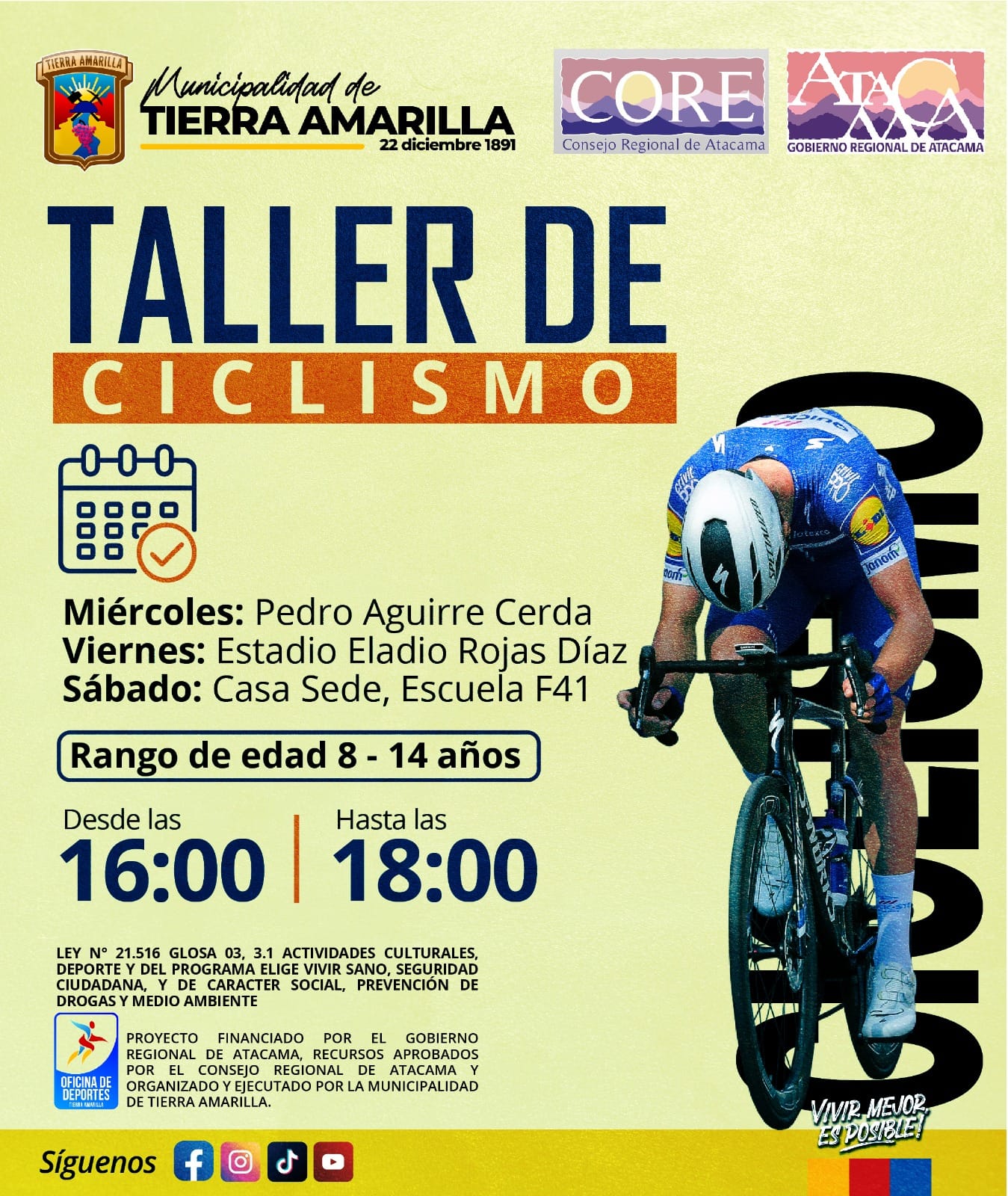 Taller de Ciclismo: para menores de 8 a 14 años, los días miércoles, viernes y sábado.