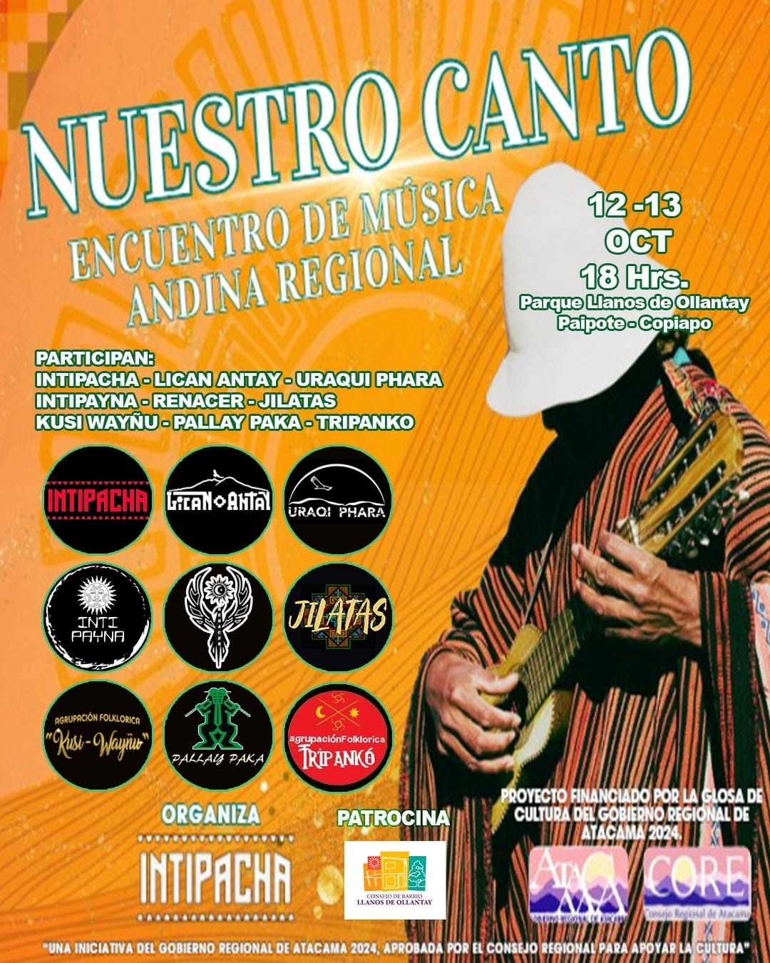 La agrupación Intipacha está invitando a la comunidad a presenciar y disfrutar del evento cultural denominado ‘Nuestro Canto: Encuentro de Música Andina Regional’, el que tendrá lugar en Parque Llanos de Ollantay-Paipote-Copiapó.