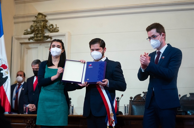 “Sabemos que es perfectible, y esperamos sea el piso mínimo que contribuya a consolidar una sociedad con mayor equidad”, reconoció la presidenta, quien estampó su firma y entregó un ejemplar al mandatario Boric.