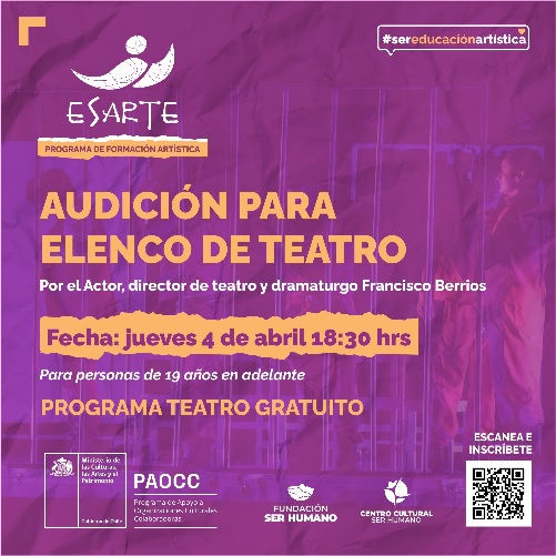 Esarte este 2024 invita a participar de una audición de teatro. No te pierdas la oportunidad de aprender, desarrollar confianza en tí mism@, y ser parte de un montaje escénico.