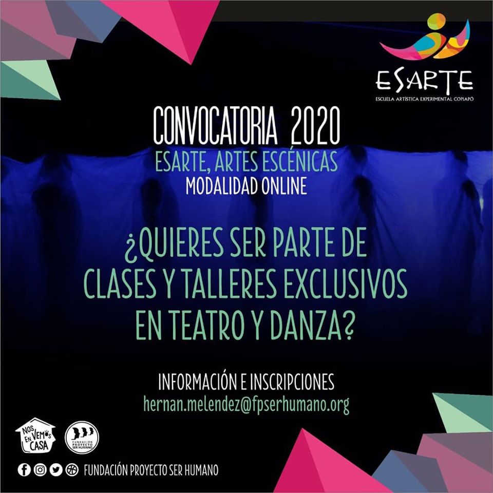 Fundación Proyecto Ser Humano invita a participar de actividades formativas, y si te interesan las artes escénicas y te gustaría continuar desarrollando tus habilidades en la danza o en el teatro desde tu casa, inscríbete y se parte de la comunidad ESARTE modalidad online 2020, Es así que recibirás ofertas exclusivas de clases con destacados profesores de la Región y de todo Chile, también podrás tener acceso a talleres, clases de muestras gratis y cápsulas de entrenamiento e información y tips para trabajar desde tu hogar.
