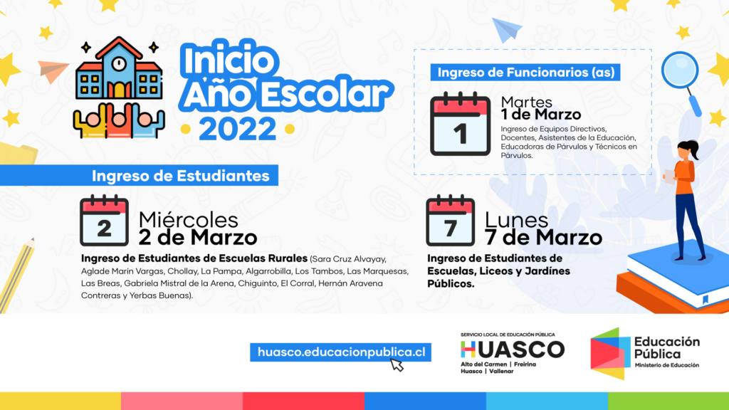 Renato Canales López, Jefe de la Unidad de Apoyo Técnico Pedagógico del SLEP Huasco, comentó “Hemos solicitado al Ministerio de Educación el inicio del año escolar desfasado en tres días respecto de lo que indica el Calendario Escolar nacional; de esta manera los y las docentes, equipos directivos y técnicos y asistentes de la educación se incorporarán a sus funciones el martes 01 de marzo, mientras que los estudiantes lo harán el lunes 07 de marzo; estos tres días de postergación nos permitirán verificar que las condiciones de funcionamiento en cada establecimiento sean las adecuadas, que los docentes y asistentes analicen las disposiciones que declara el nuevo protocolo de medidas sanitarias para los establecimientos escolares y que acuerden la manera de cumplirlas adecuadamente; en estos días también habrá oportunidad para la organización del año escolar y, sobre todo, para que los y las docentes cuenten con tiempo suficiente para preparar la enseñanza”.
