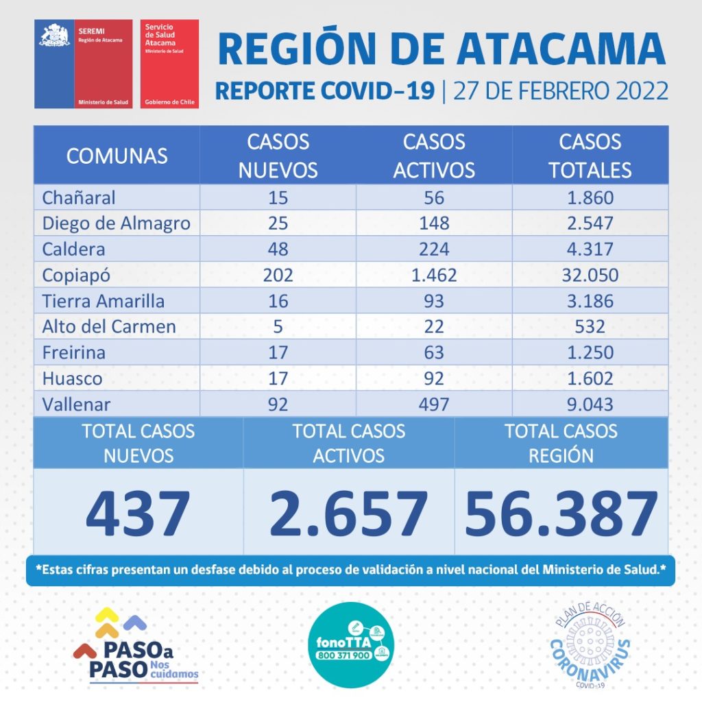 Este domingo 27 de febrero se reportan 437 nuevos casos positivos de Coronavirus en la región de Atacama