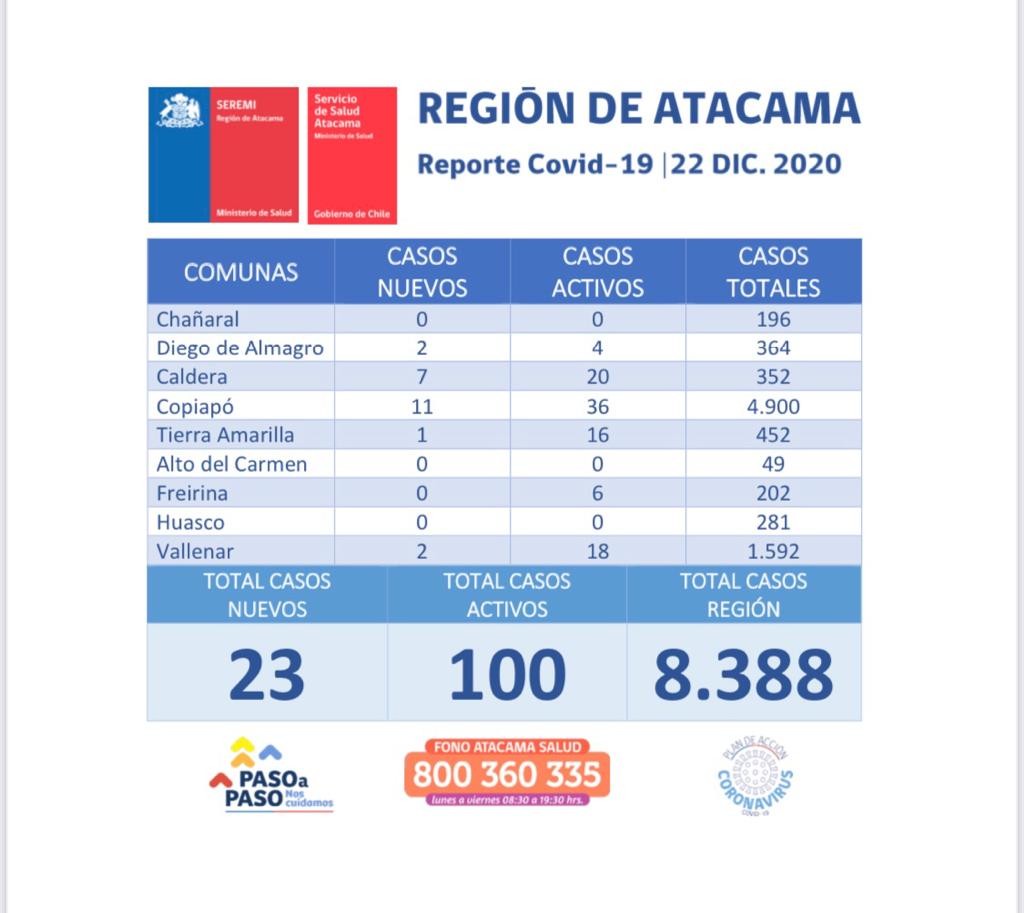 La autoridad sanitaria informó este martes un total de 23 casos nuevos de COVID-19 en la región de Atacama, de los cuales 11 fueron sintomáticos y 12 sin síntomas.