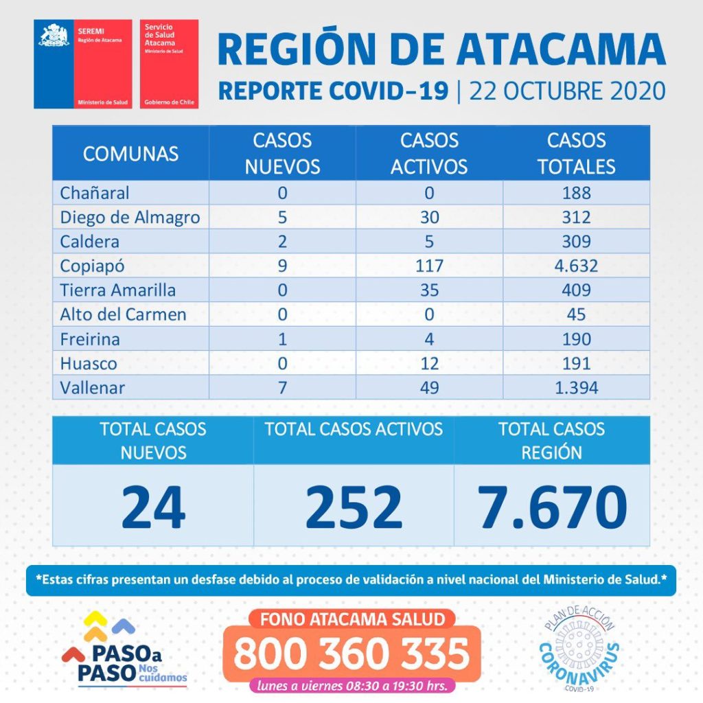El Minsal informó este jueves 24 casos nuevos de Coronavirus en la región de Atacama, de ellos 19 fueron casos sintomáticos y 5 sin síntomas, además se informó de 252 casos activos a nivel regional.