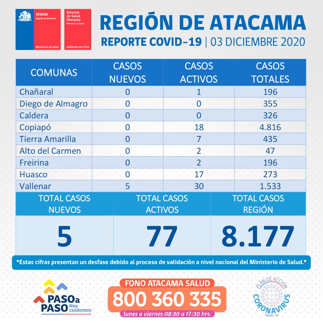La autoridad sanitaria informó este jueves 5 casos nuevos COVID-19 en Atacama, de los cuales 3 fueron casos sintomáticos y dos sin síntomas, además se informó de 77 casos activos a nivel regional.