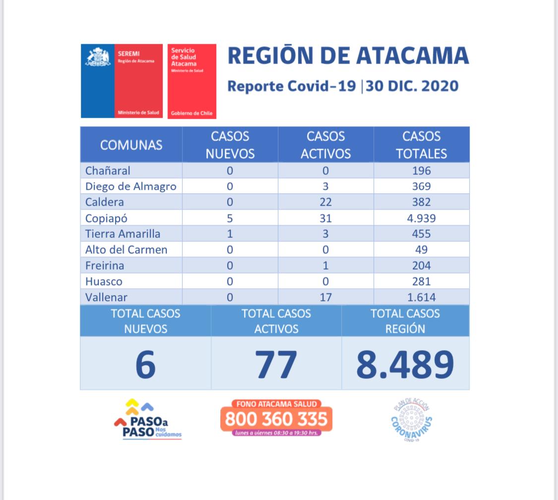 La autoridad sanitaria informó este miércoles un total de 6 casos nuevos de COVID-19 en la región de Atacama, de los cuales cinco fueron sintomáticos y uno sin síntomas, además de un informe que dio cuenta de 77 casos activos a nivel regional.