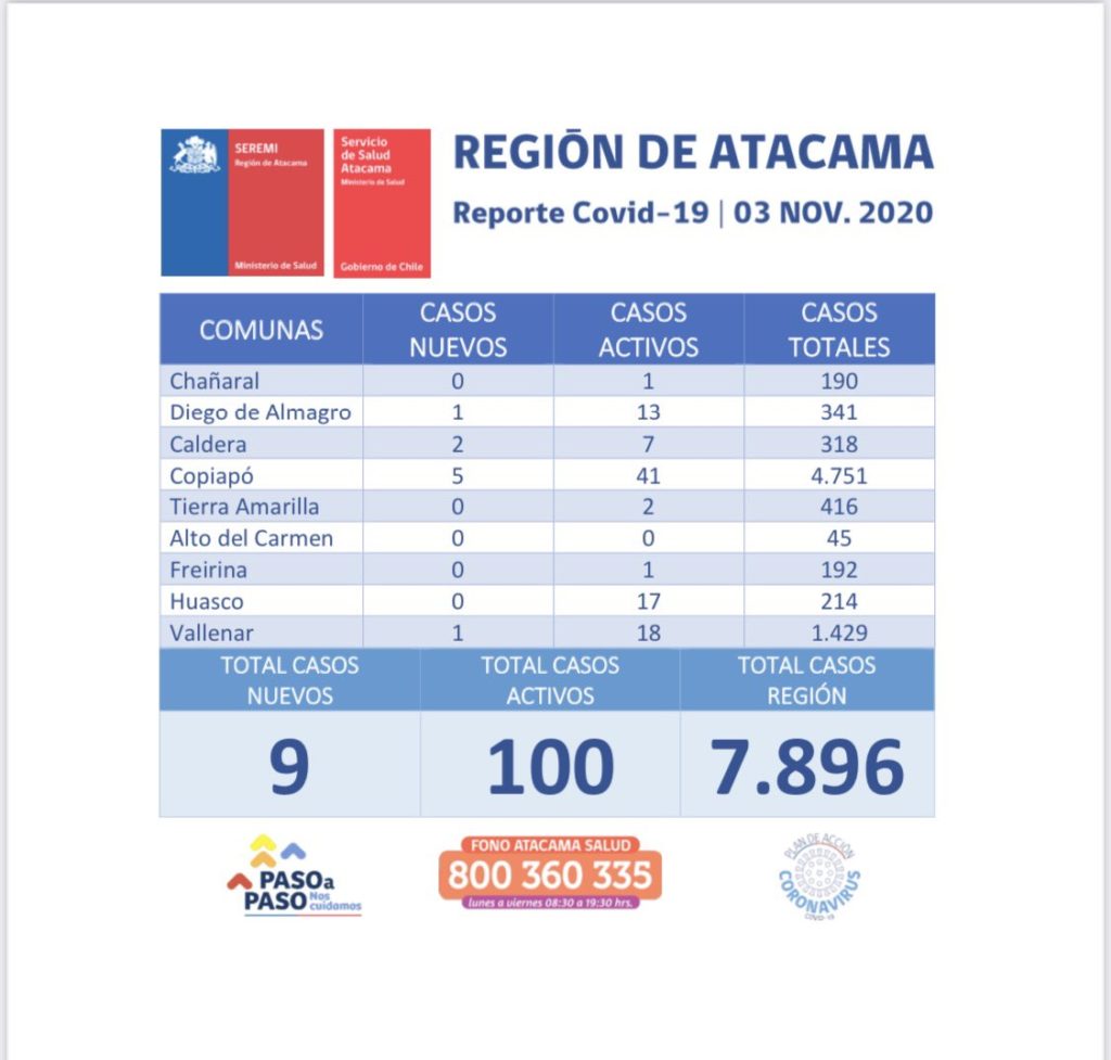 Hoy martes 3 de noviembre se reportan 9 casos nuevos positivos de Coronavirus en la región de Atacama, con un total de 100 activos a nivel regional.