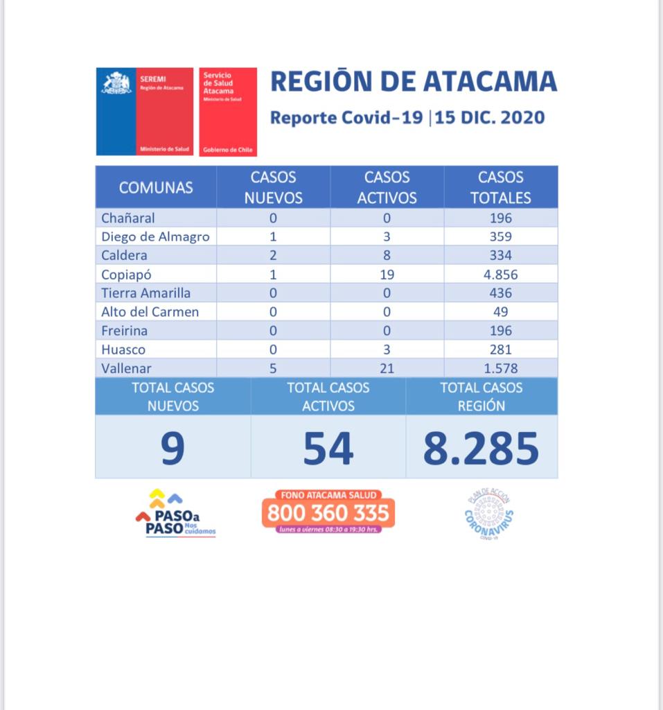 La autoridad sanitaria informó este martes nueve casos nuevos de COVID-19 en Atacama, de los cuales tres fueron casos sintomáticos y 6 sin síntomas, además de entregó un reporte de 54 casos activos a nivel regional .