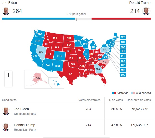 De acuerdo con AP, Biden cuenta ahora con 264 votos electorales y Trump con 214. De esta manera, al obtener los 20 votos de Pensilvania, el demócrata se haría con la victoria en la carrera presidencial.