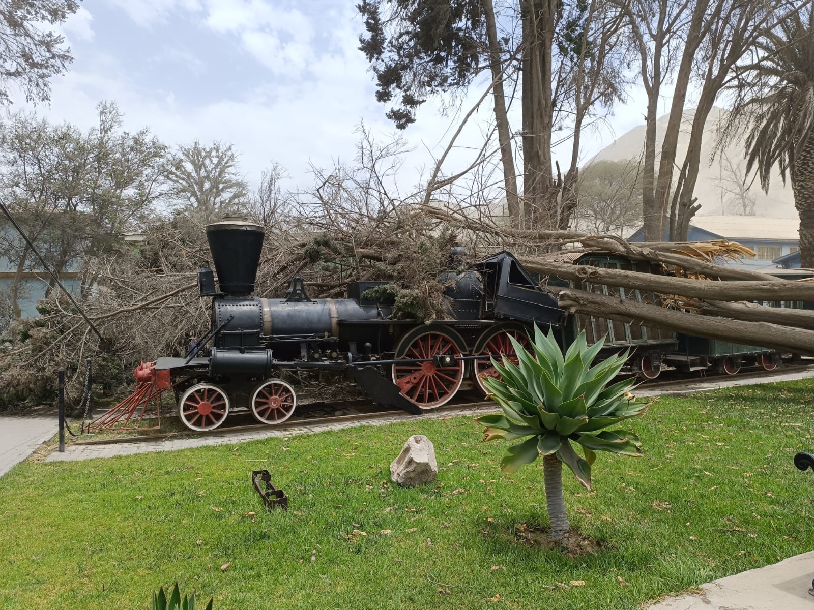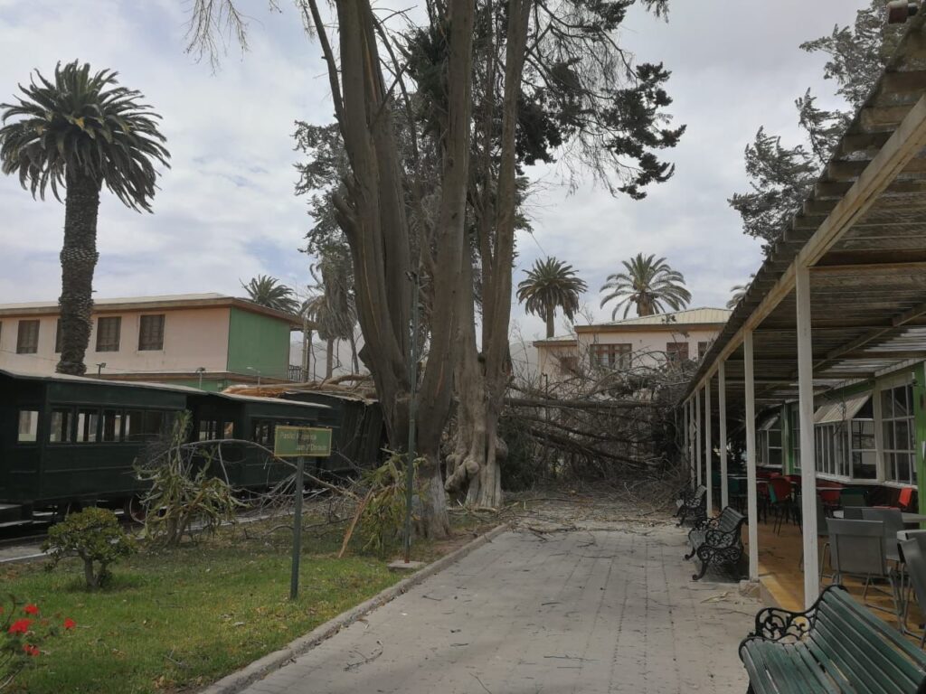 El monumento nacional la locomotora, conocida como «La Copiapó», que se encuentra al interior de la Universidad de Atacama, resultó con serios daños tras ser aplastada por añosos árboles que cayeron a consecuencia del inesperado y fuerte temporal de viento y arena que esta tarde afecta a la capital regional y alrededores. Además, el inusual fenómeno climático provocó otros estragos, como la caída de pimientos en otros lugares y la interrupción de la energía eléctrica en El Palomar y en Tierra Amarilla.