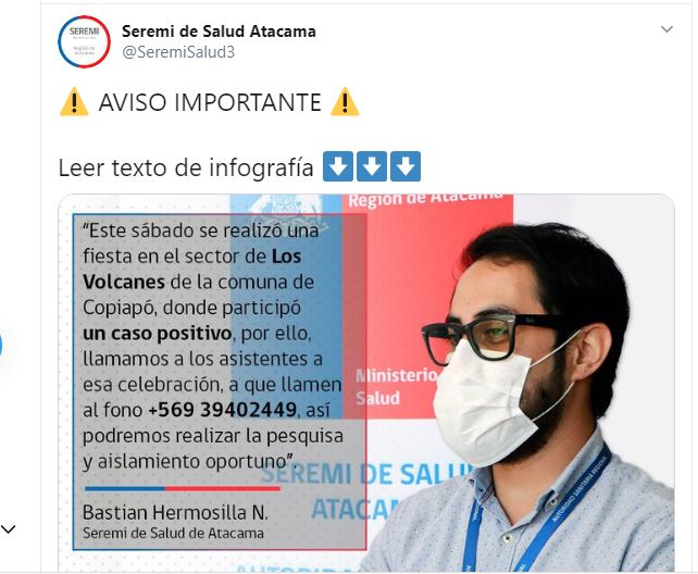 El Seremi de Salud llamó a la responsabilidad de las personas que participaron de la fiesta y pidió que se comuniquen al número +56 9 3940 2449 para recibir la orientación respectiva.