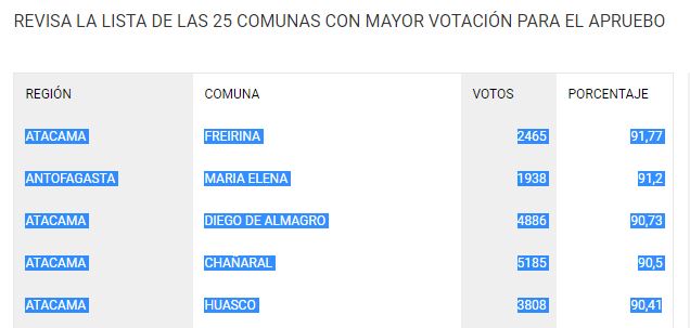 Pero junto con Freirina, otras cinco comunas de Atacama entraron en el top 25 en las que la opción del cambio sacó mayor diferencia; Diego de Almagro fue la tercera del conteo nacional con 90,73. En cuarto lugar estuvo Chañaral con 90,5 y Huasco de quinta con 90,41.
