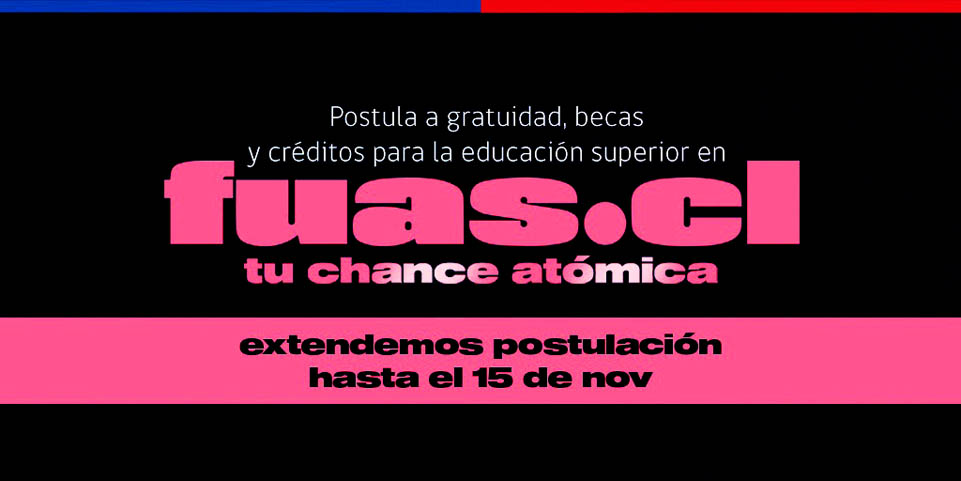 Con el objetivo de que todos los jóvenes que aún no han podido concluir su inscripción tengan tiempo para hacerlo, el Ministerio de Educación extendió el proceso de postulación a la gratuidad, becas y créditos para la Educación Superior 2020 hasta el próximo viernes 15 de noviembre a las 14:00 horas. En este proceso, los estudiantes que quieran ingresar a centros de formación técnica, institutos profesionales o universidades, y aquellos que ya están cursando una carrera y no cuentan con ayudas estudiantiles, podrán completar el Formulario Único de Acreditación Socioeconómica (FUAS) en www.fuas.cl y así estar postulando a todos los beneficios estudiantiles del Estado.