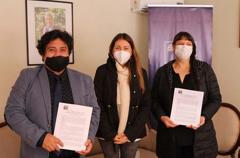 La Seremi de las Culturas, las Artes y el Patrimonio de Atacama María Cecilia Simunovic Ramírez, junto a la directora ejecutiva de la Fundación Proyecto Ser Humano Maribel Pinto Fernández, y el coordinador de Educación Artística Hernán Meléndez Cáceres, firmaron el convenio de ejecución del Programa Acciona para el periodo 2021.