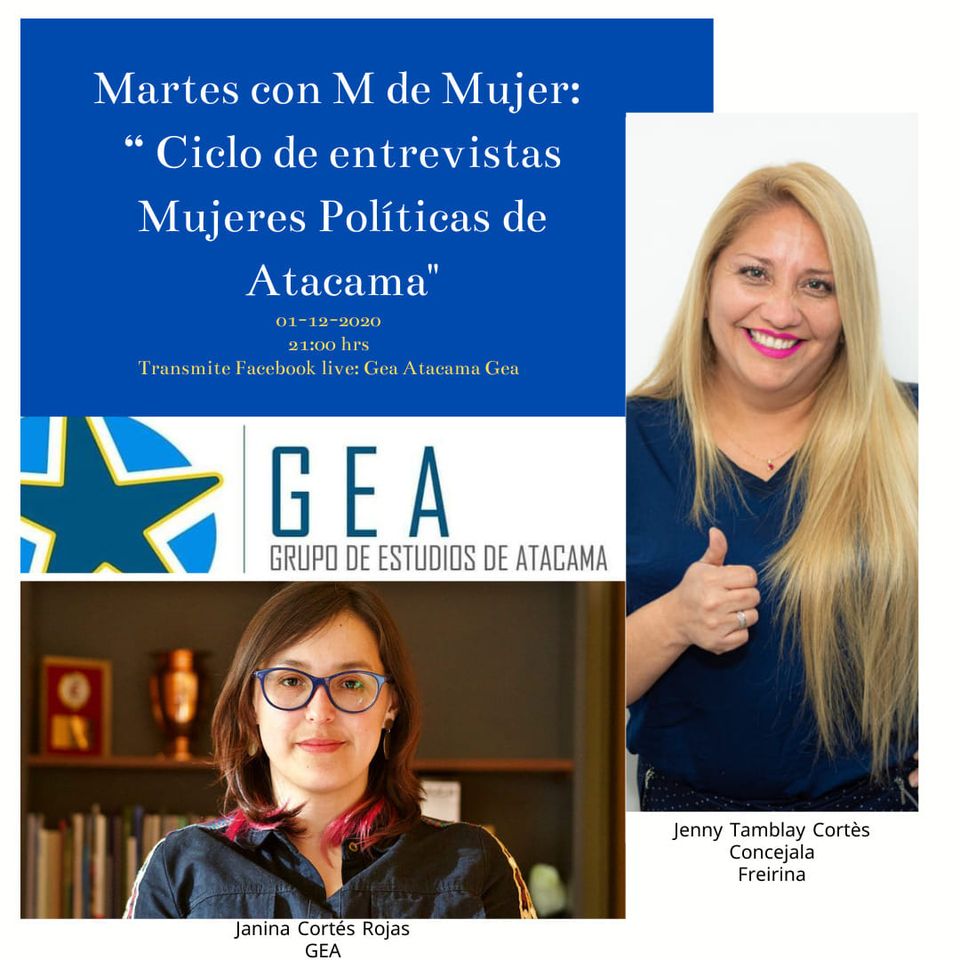 El Grupo de Estudios de Atacama Gea invita a participar este día martes 01 de diciembre a lo que será el último «Martes con M de mujer». En la ocasión se entrevistará a mujeres políticas, cerrando el ciclo con Jenny Carolina Tamblay Cortés concejala de la comuna de Freirina.