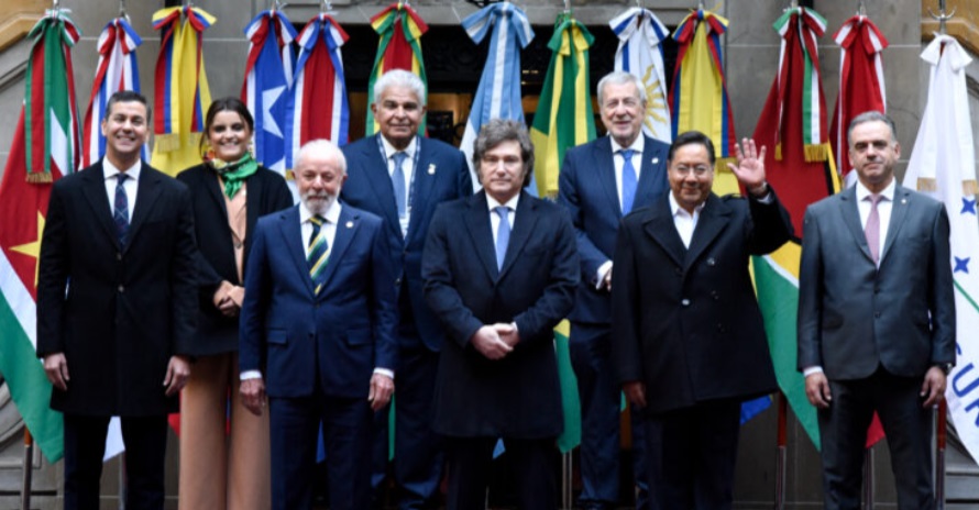 El anfitrión de la cumbre, el argentino Javier Milei, recibió en la sede de la Cancillería a sus homólogos de Brasil, Luiz Inácio Lula da Silva; de Uruguay, Yamandú Orsi; de Paraguay, Santiago Peña; y de Bolivia, Luis Arce.