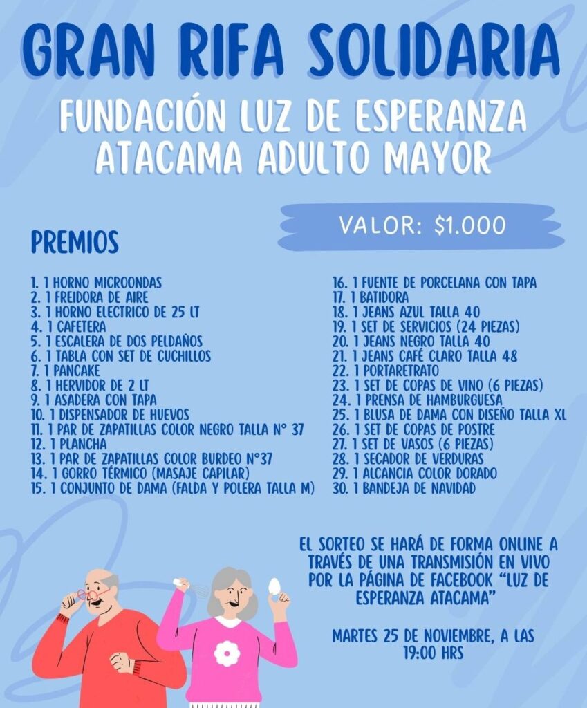 La Fundación Luz de Esperanza Atacama te invita a participar en su rifa, una hermosa oportunidad para apoyar a nuestros adultos mayores y fortalecer los lazos que nos unen como comunidad.