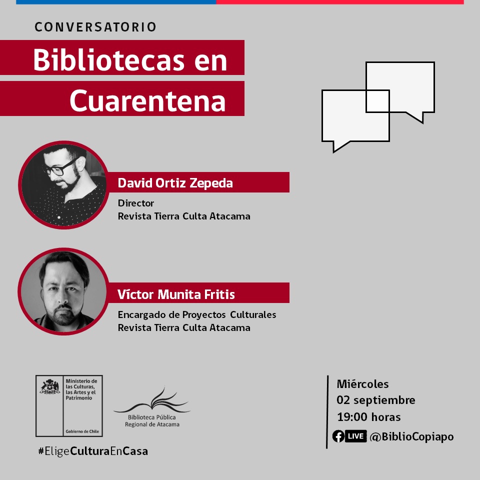 Hoy miércoles tendrá lugar, desde las 19:00 horas, una nueva jornada de Conversatorio “Bibliotecas en Cuarentena», espacio de conversación con personas que han sido relevantes en las bibliotecas y el incentivo de la lectura y escritura.