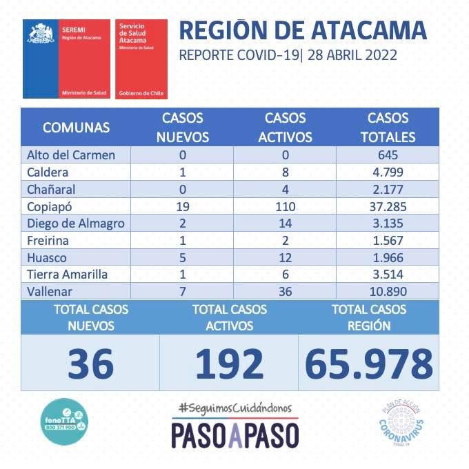 Este jueves 28 abril se reportan 36 nuevos casos positivos de Coronavirus en la región de Atacama. 19 casos corresponden a la comuna de Copiapó, 7 casos a la comuna de Vallenar, 5 casos a la comuna de Huasco, 2 casos a la comuna de Diego de Almagro, 1 casos a la comuna de Caldera, 1 caso a la comuna de Freirina, y 1 caso a la comuna de Tierra Amarilla.